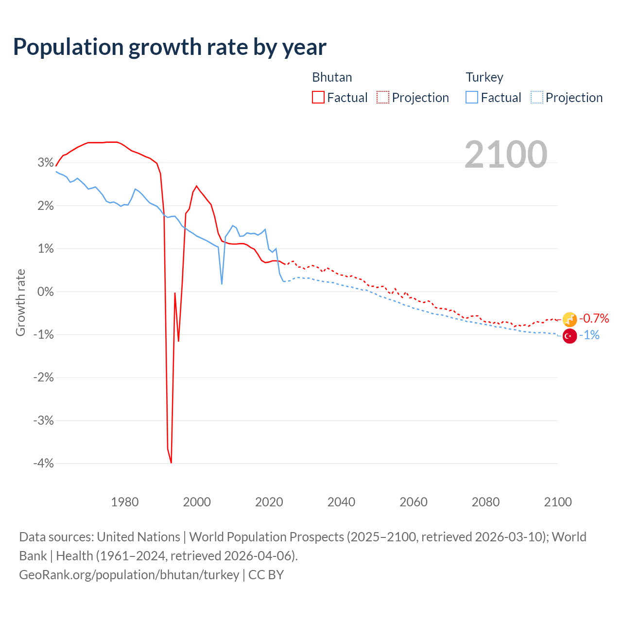 - For the last 10 years, Bhutan has had an average growth rate of +0.8% per year vs +1.06% in Turkey.