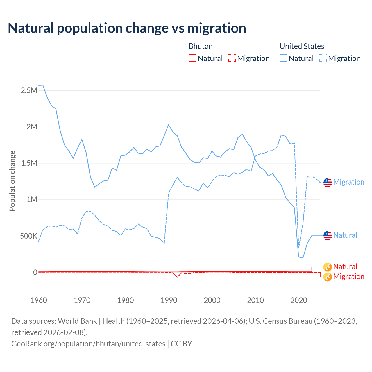 Over the last 10 years, 93.3% of the population change in Bhutan is from natural causes (a gain of 55,796 people) and 6.74% is from migration (a gain of 4,035 people). In the United States 35.8% is from natural causes (a gain of 8,005,866 people) and 64.2% is from migration (a gain of 14,334,286 people).