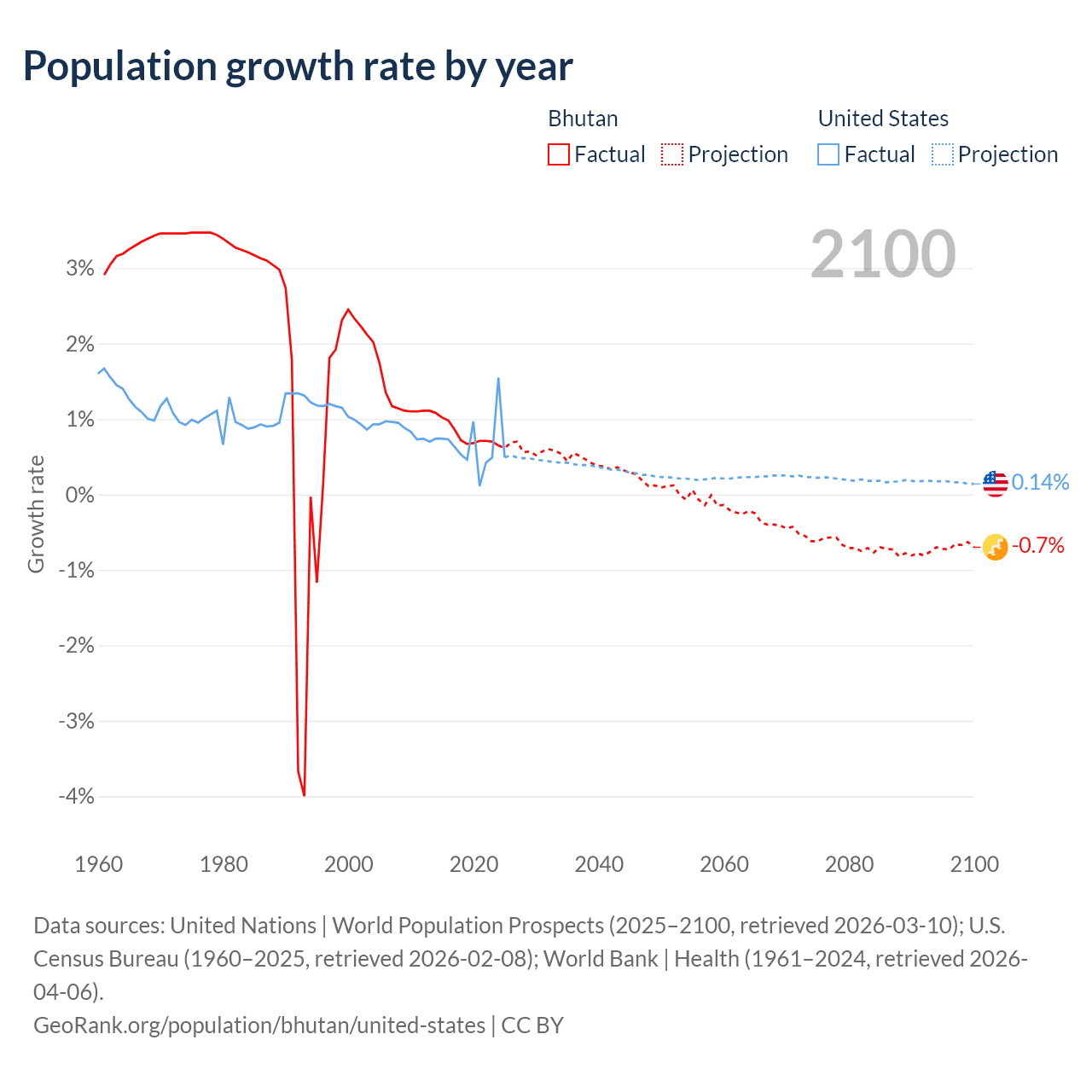 Data sources: World Bank | Health (1960–2024, retrieved 2026-04-06); United Nations | World Population Prospects (1960–2026, retrieved 2026-03-10); U.S. Census Bureau (1960–2025, retrieved 2026-02-08); Central Intelligence Agency (CIA) (2000–2019, retrieved 2026-02-20).
