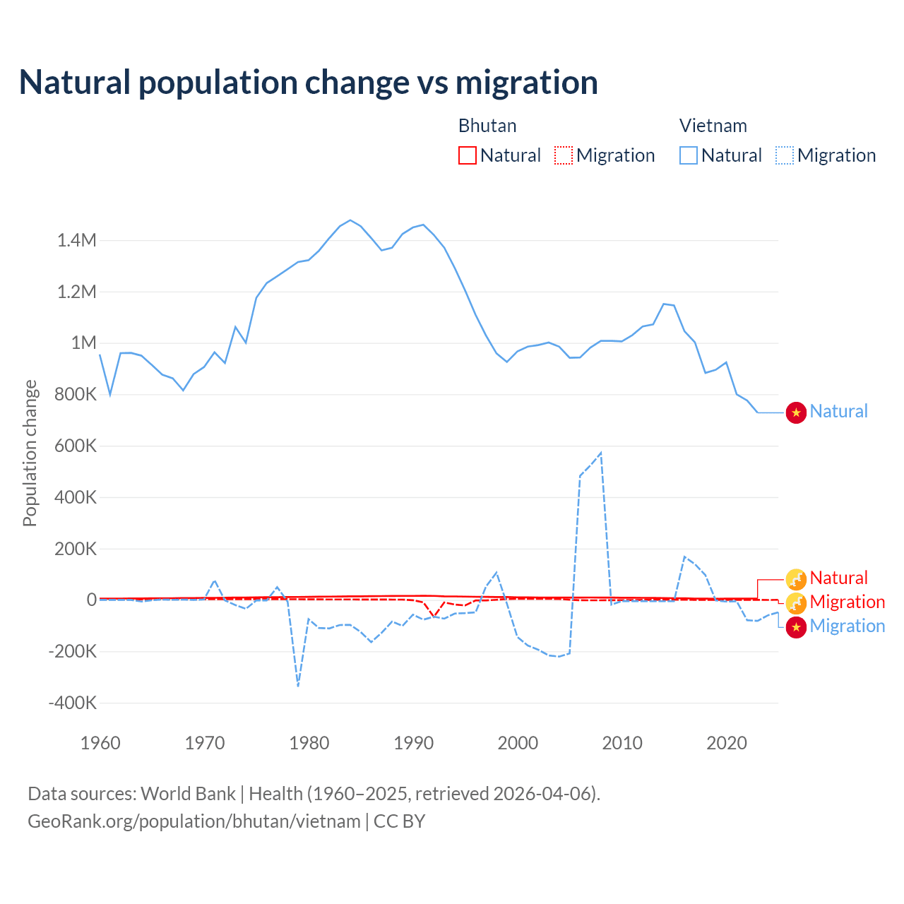 Over the last 10 years, 93.3% of the population change in Bhutan is from natural causes (a gain of 55,796 people) and 6.74% is from migration (a gain of 4,035 people). In Vietnam 97.7% is from natural causes (a gain of 9,349,756 people) and 2.29% is from migration (a gain of 219,073 people).