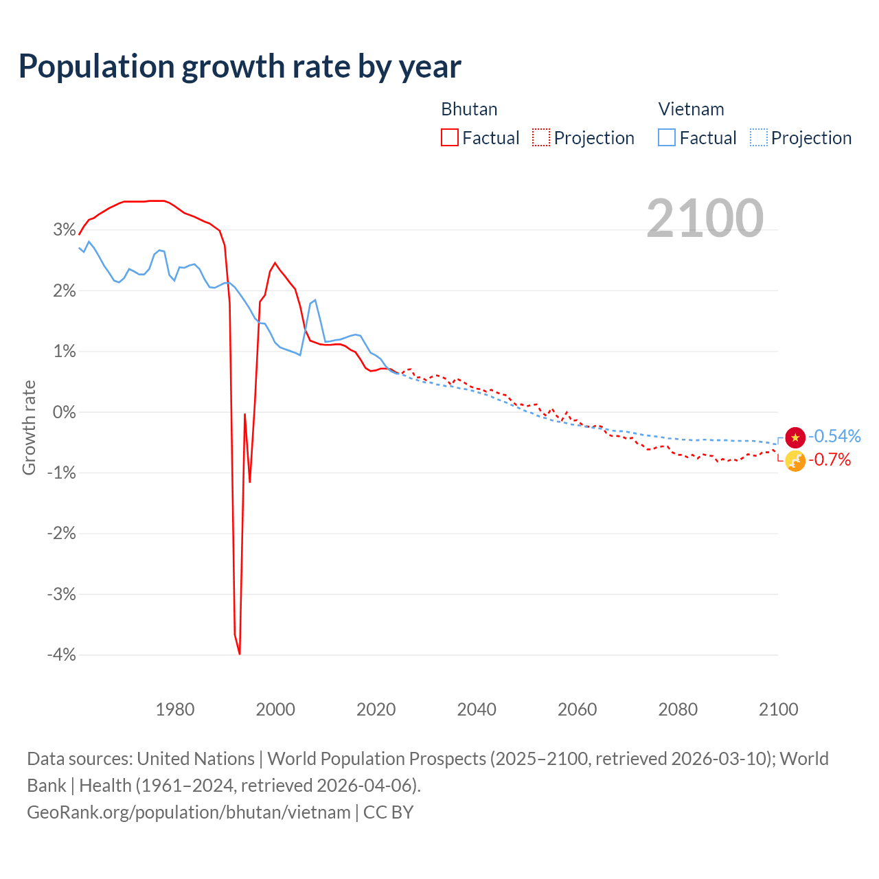 - For the last 10 years, Bhutan has had an average growth rate of +0.8% per year vs +0.99% in Vietnam.