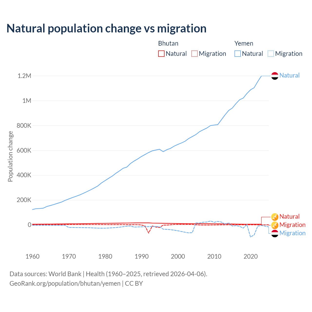 Over the last 10 years, 93.3% of the population change in Bhutan is from natural causes (a gain of 55,796 people) and 6.74% is from migration (a gain of 4,035 people). In Yemen 97.8% is from natural causes (a gain of 10,460,813 people) and 2.17% is from migration (a loss of 231,814 people).