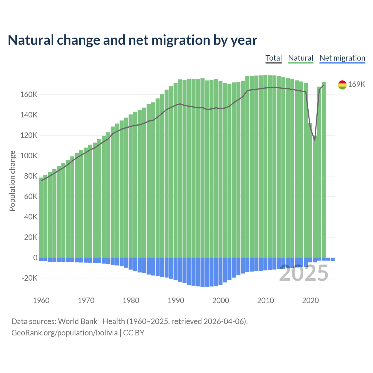 Over the last 10 years, 95.6% of the population change in Bolivia is from natural causes (a gain of 1,637,833 people) and 4.37% is from migration (a loss of 74,903 people).