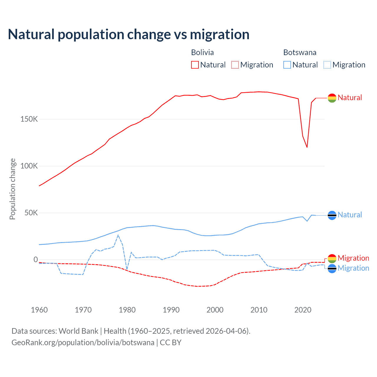 Over the last 10 years, 95.6% of the population change in Bolivia is from natural causes (a gain of 1,637,833 people) and 4.37% is from migration (a loss of 74,903 people). In Botswana 82.5% is from natural causes (a gain of 436,373 people) and 17.5% is from migration (a loss of 92,293 people).