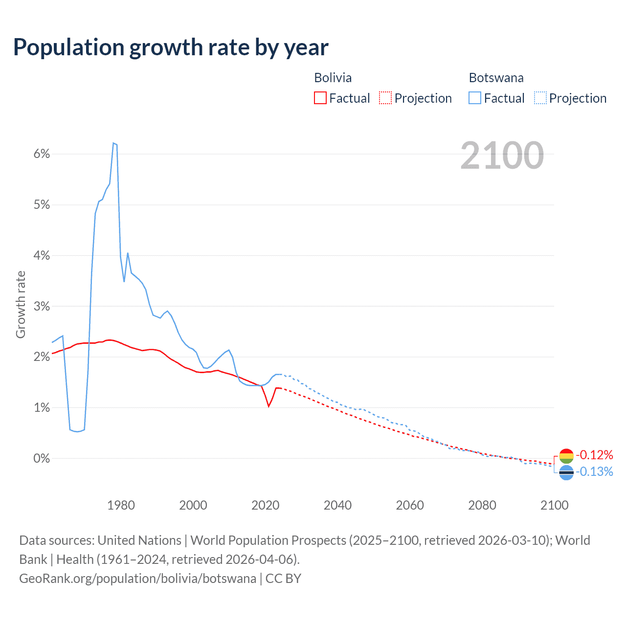 - For the last 10 years, Bolivia has had an average growth rate of +1.37% per year vs +1.5% in Botswana.