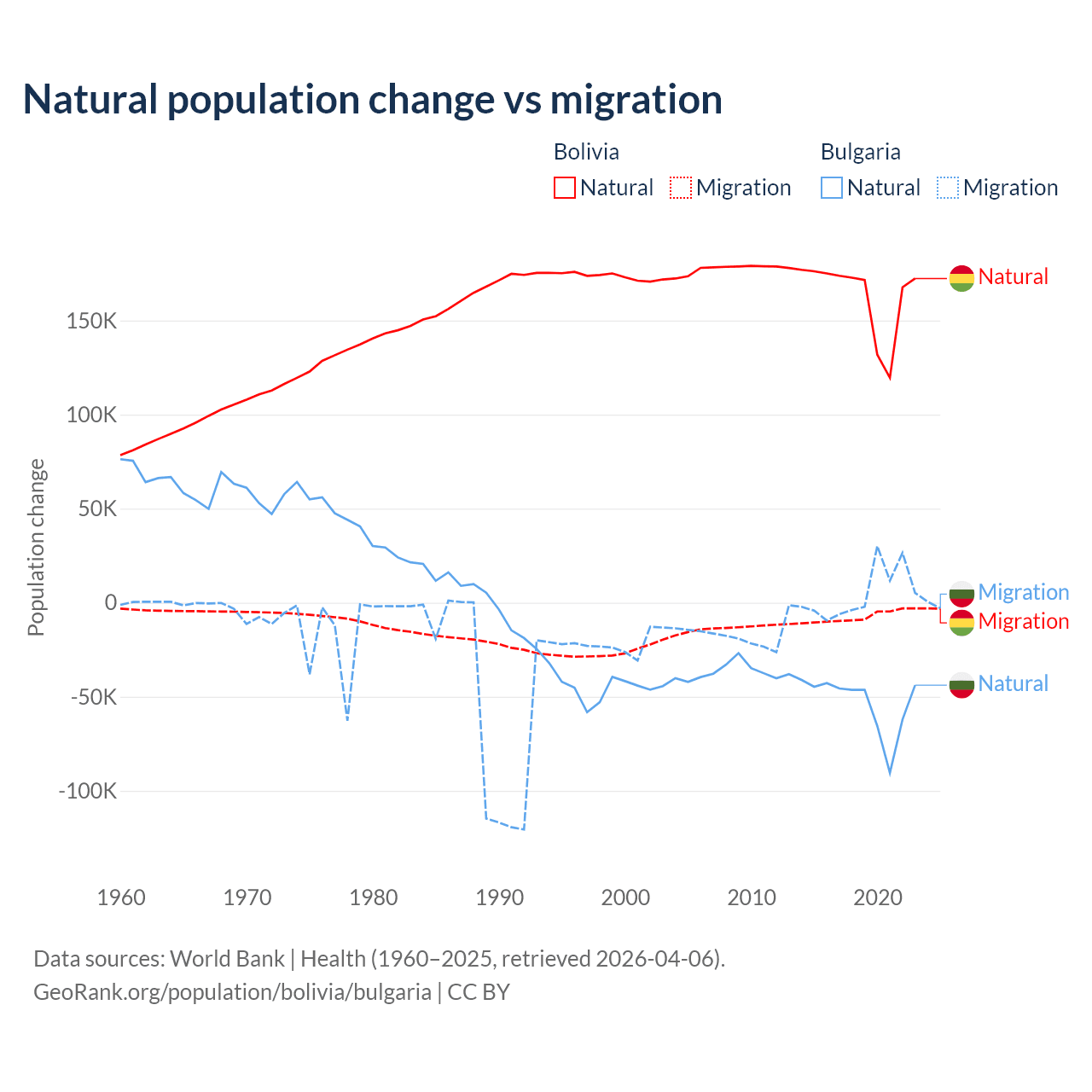 Over the last 10 years, 95.6% of the population change in Bolivia is from natural causes (a gain of 1,637,833 people) and 4.37% is from migration (a loss of 74,903 people). In Bulgaria 92.1% is from natural causes (a loss of 528,535 people) and 7.94% is from migration (a gain of 45,567 people).