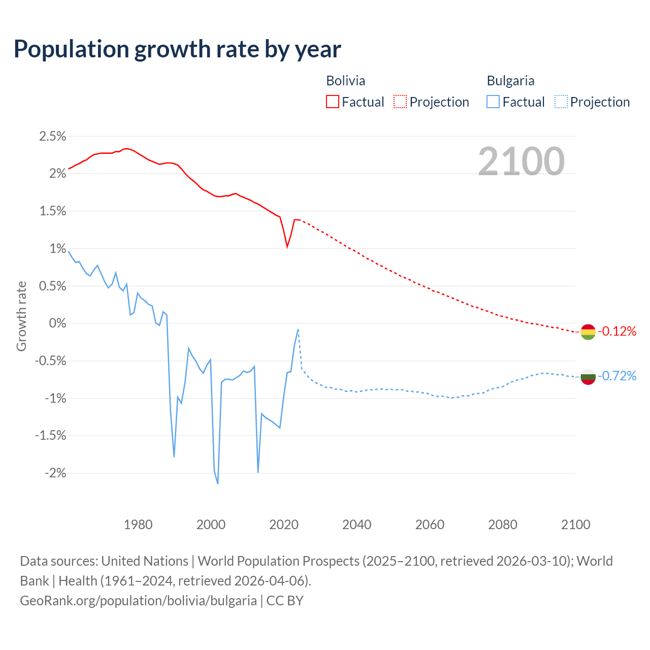 - For the last 10 years, Bolivia has had an average growth rate of +1.37% per year vs -0.96% in Bulgaria.