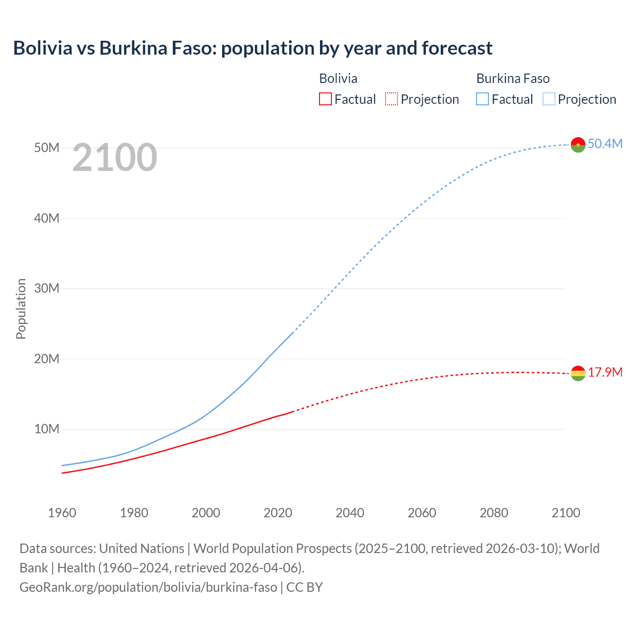 Bolivia vs Burkina Faso: population by year and forecast