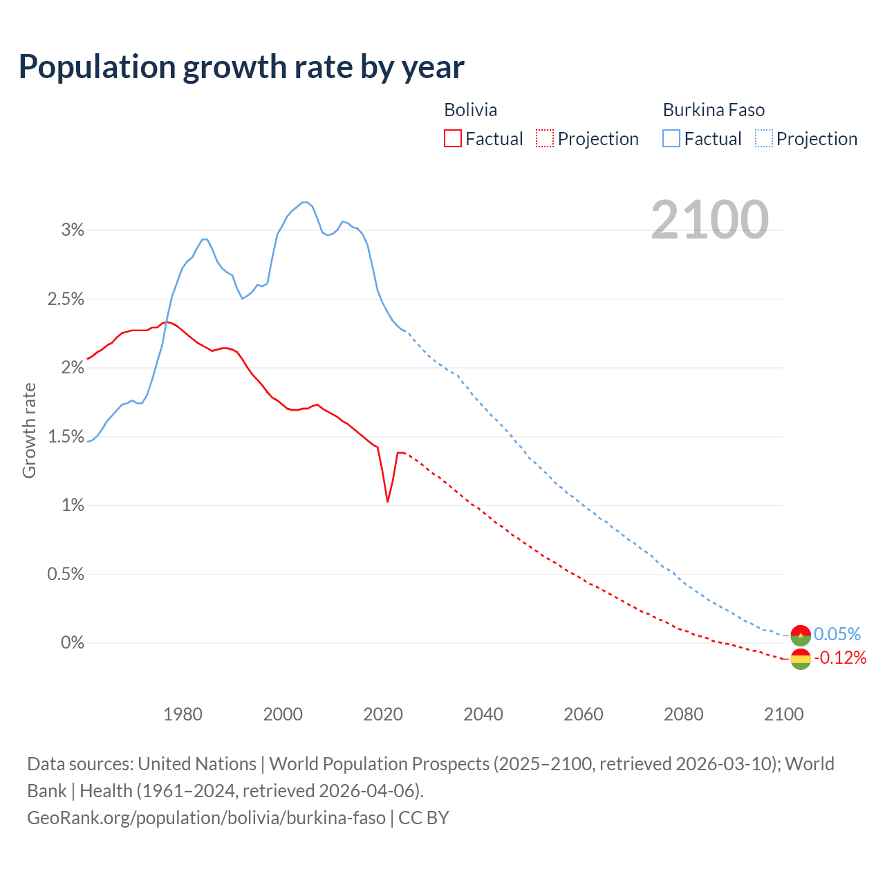 - For the last 10 years, Bolivia has had an average growth rate of +1.37% per year vs +2.63% in Burkina Faso.