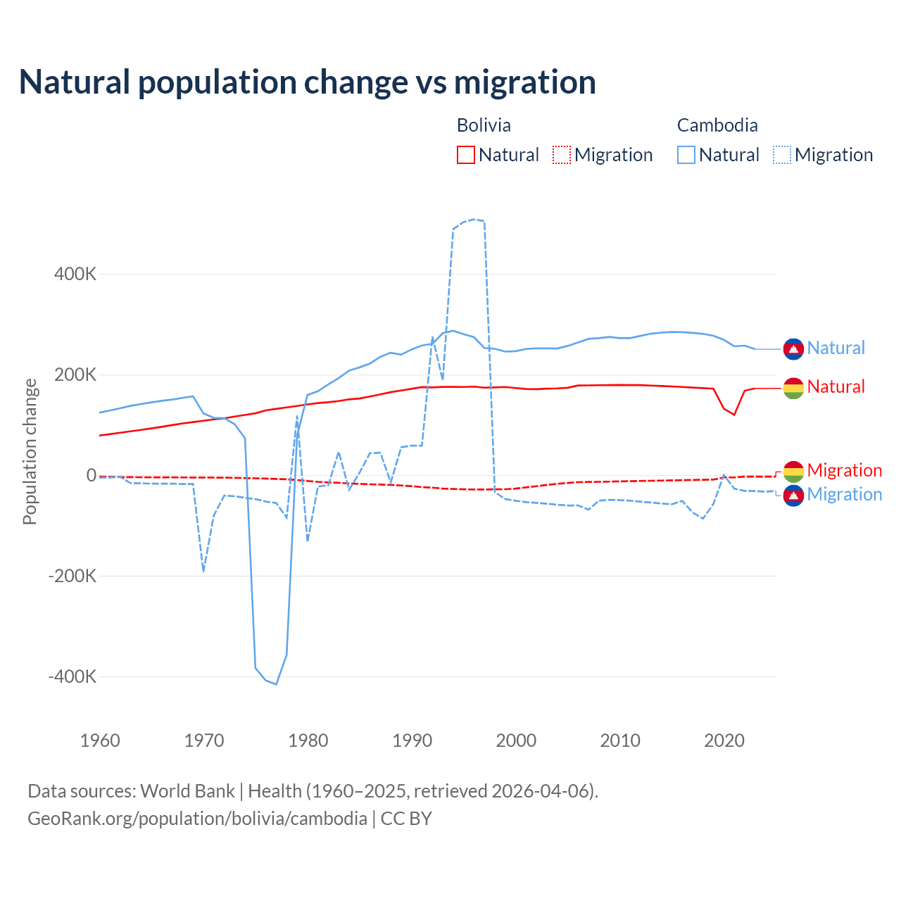 Over the last 10 years, 95.6% of the population change in Bolivia is from natural causes (a gain of 1,637,833 people) and 4.37% is from migration (a loss of 74,903 people). In Cambodia 85.2% is from natural causes (a gain of 2,724,147 people) and 14.8% is from migration (a loss of 474,505 people).