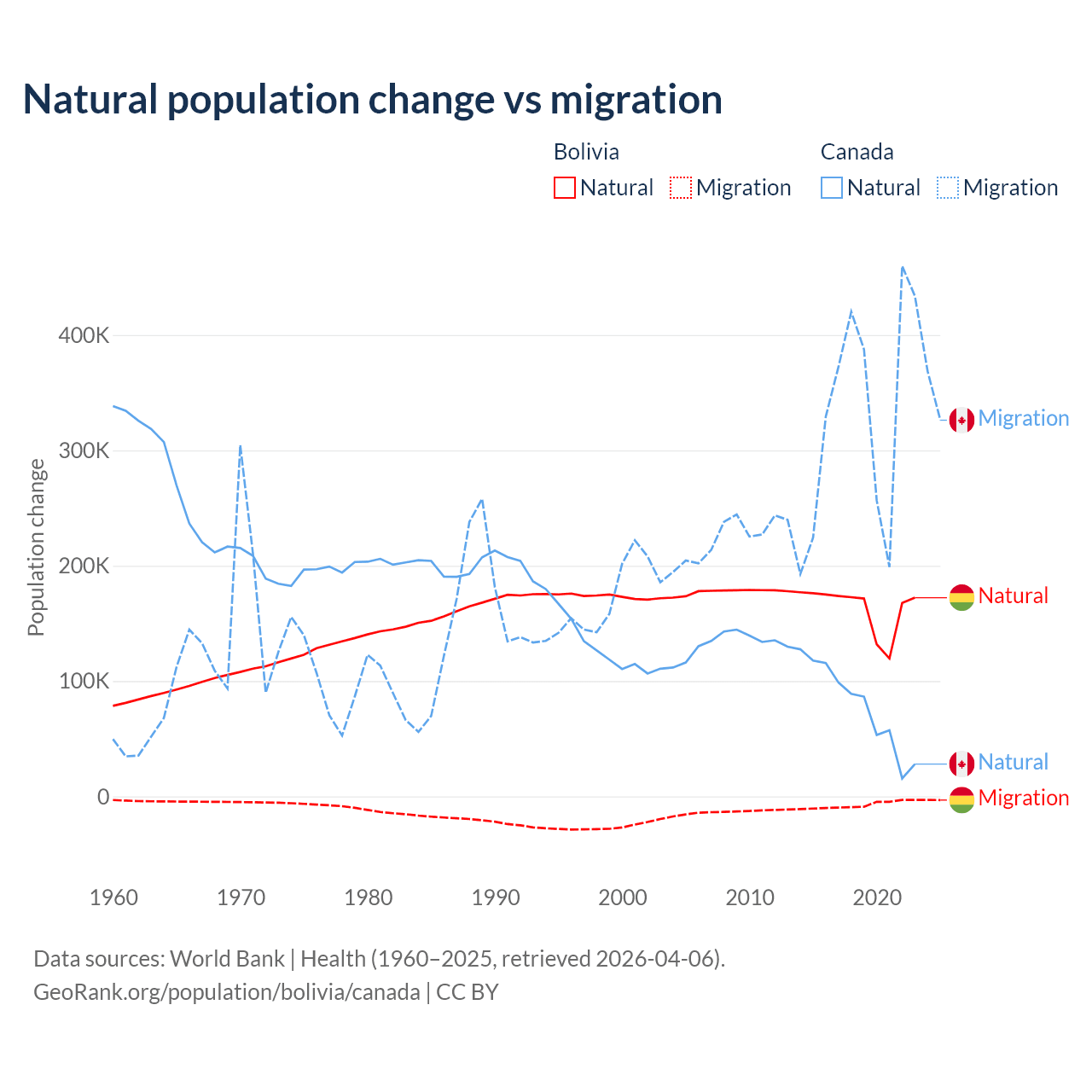 Over the last 10 years, 95.6% of the population change in Bolivia is from natural causes (a gain of 1,637,833 people) and 4.37% is from migration (a loss of 74,903 people). In Canada 19.4% is from natural causes (a gain of 789,345 people) and 80.6% is from migration (a gain of 3,276,554 people).