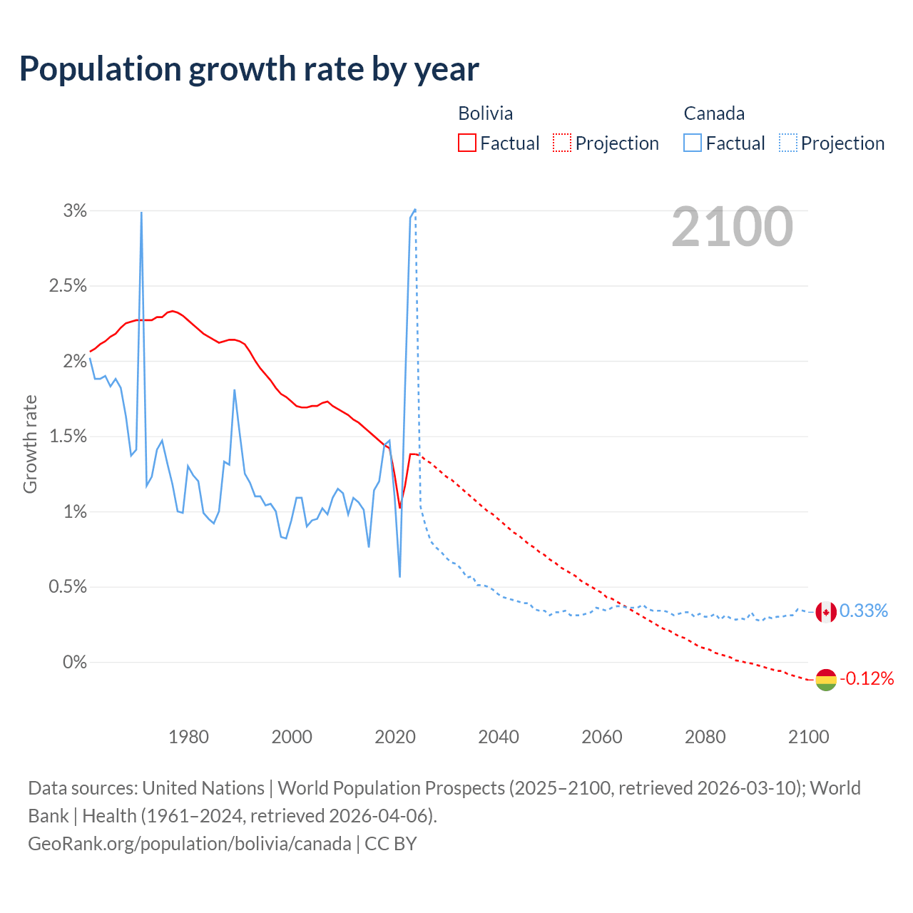 - For the last 10 years, Bolivia has had an average growth rate of +1.37% per year vs +1.5% in Canada.