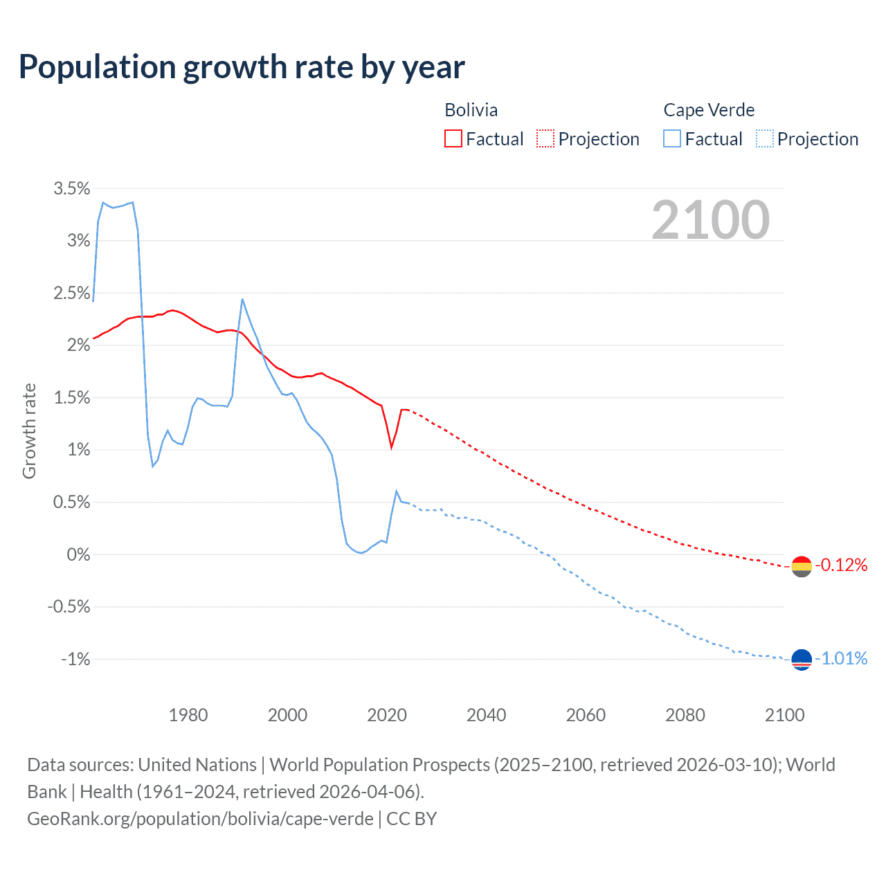 - For the last 10 years, Bolivia has had an average growth rate of +1.37% per year vs +0.22% in Cape Verde.