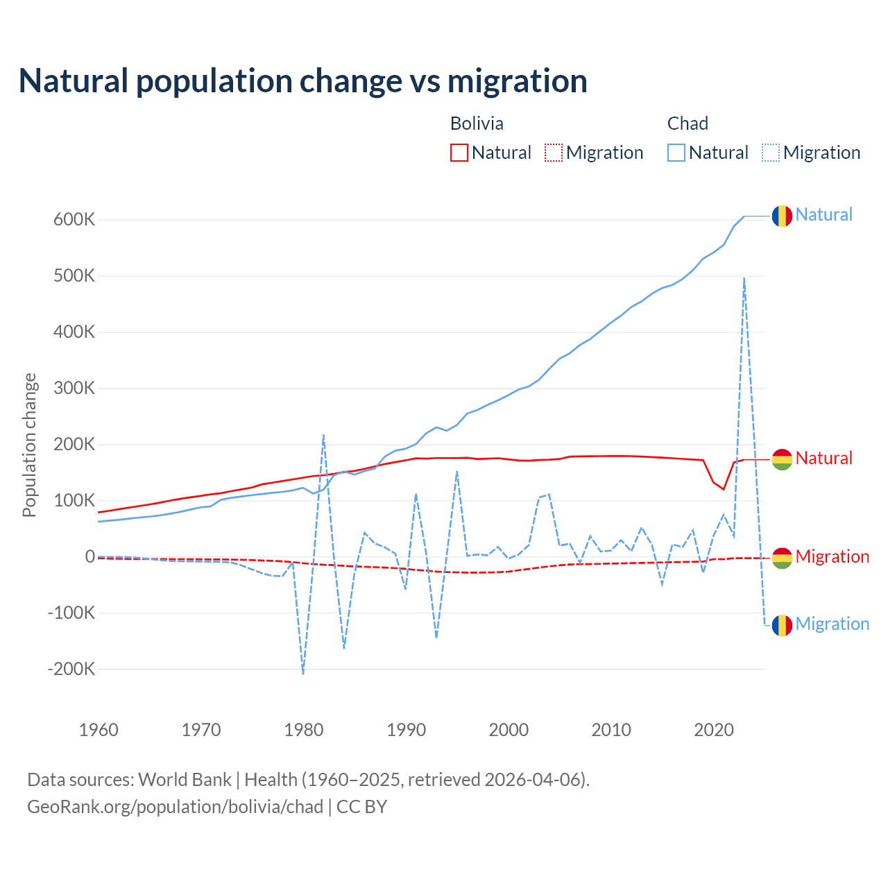 Over the last 10 years, 95.6% of the population change in Bolivia is from natural causes (a gain of 1,637,833 people) and 4.37% is from migration (a loss of 74,903 people). In Chad 88.7% is from natural causes (a gain of 5,253,964 people) and 11.3% is from migration (a gain of 672,204 people).