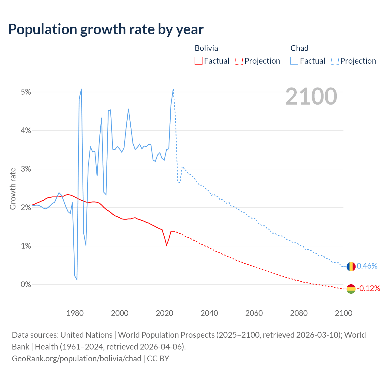 Data sources: World Bank | Health (1960–2024, retrieved 2026-04-06); United Nations | World Population Prospects (1960–2026, retrieved 2026-03-10); U.S. Census Bureau (1960–2025, retrieved 2026-02-08); Central Intelligence Agency (CIA) (2000–2019, retrieved 2026-02-20).