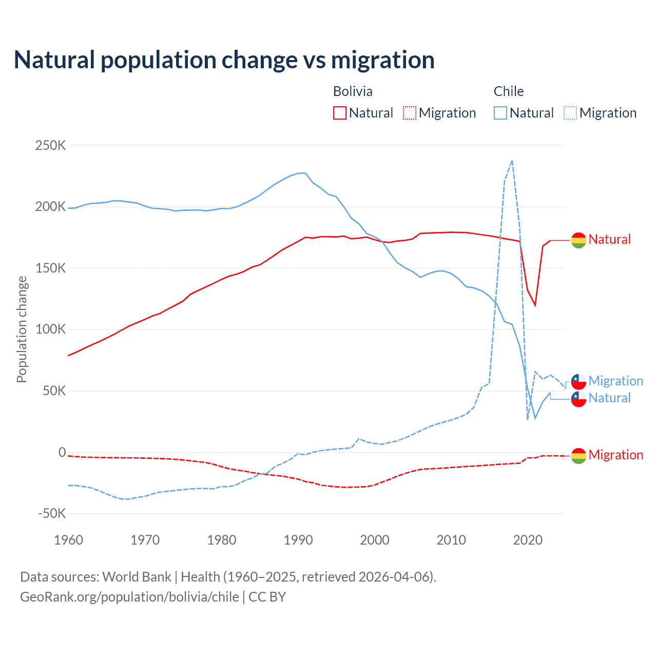 Over the last 10 years, 95.6% of the population change in Bolivia is from natural causes (a gain of 1,637,833 people) and 4.37% is from migration (a loss of 74,903 people). In Chile 43.5% is from natural causes (a gain of 844,683 people) and 56.5% is from migration (a gain of 1,097,597 people).