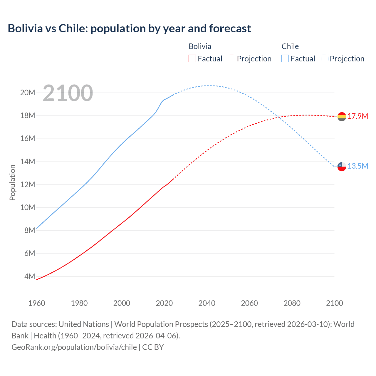 Bolivia vs Chile: population by year and forecast