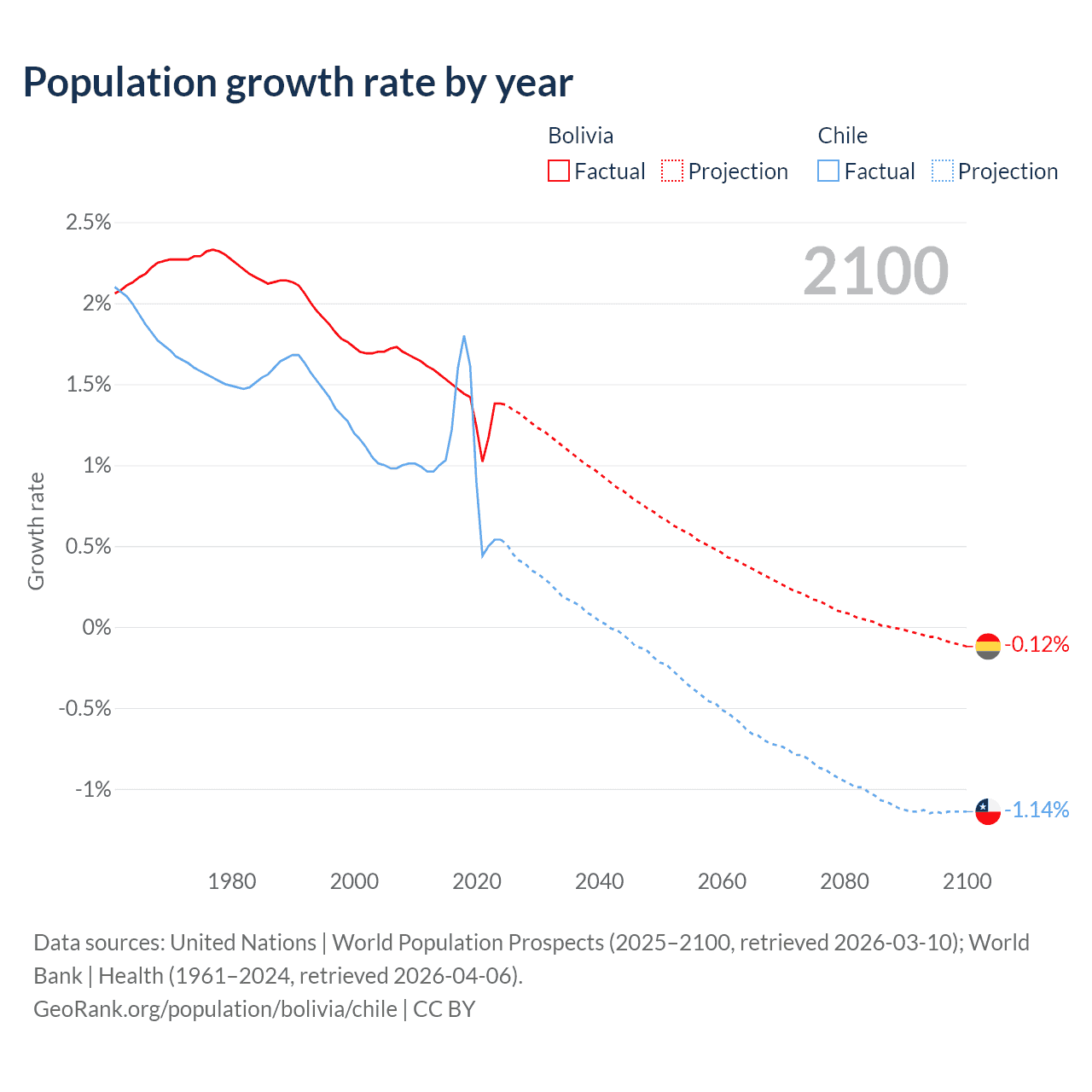 Data sources: World Bank | Health (1960–2024, retrieved 2026-04-06); United Nations | World Population Prospects (1960–2026, retrieved 2026-03-10); U.S. Census Bureau (1960–2025, retrieved 2026-02-08); Central Intelligence Agency (CIA) (2000–2019, retrieved 2026-02-20).