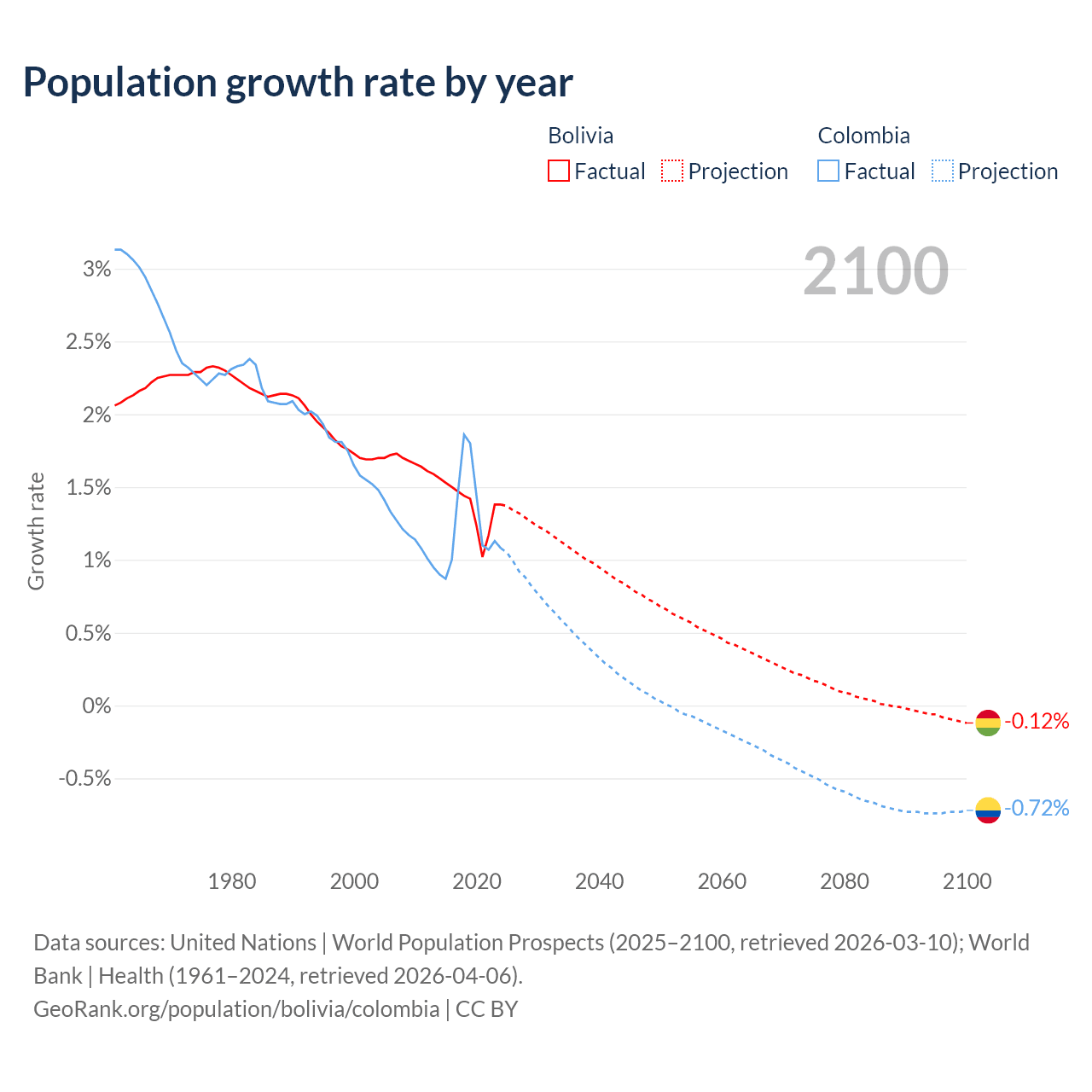 - For the last 10 years, Bolivia has had an average growth rate of +1.37% per year vs +1.25% in Colombia.