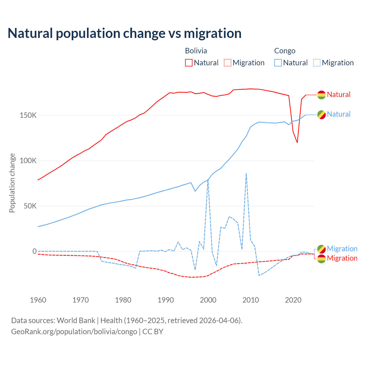 Over the last 10 years, 95.6% of the population change in Bolivia is from natural causes (a gain of 1,637,833 people) and 4.37% is from migration (a loss of 74,903 people). In the Congo 94% is from natural causes (a gain of 1,434,056 people) and 6.04% is from migration (a loss of 92,251 people).