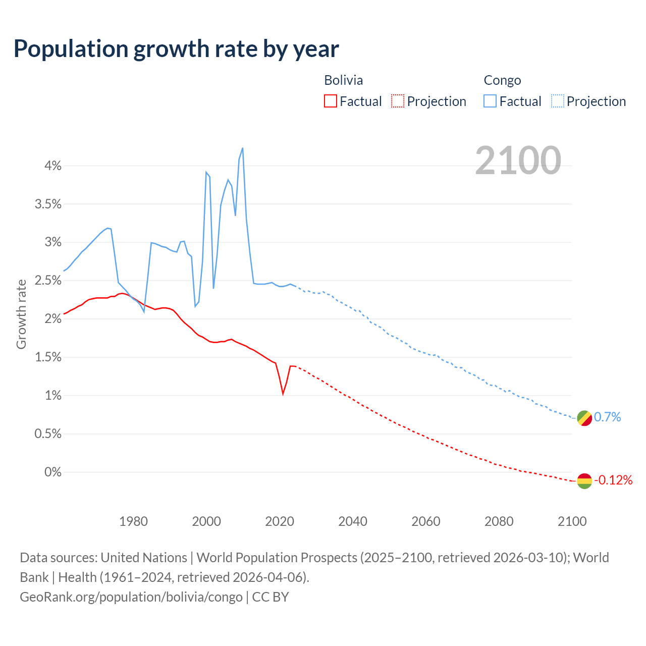 - For the last 10 years, Bolivia has had an average growth rate of +1.37% per year vs +2.44% in the Congo.