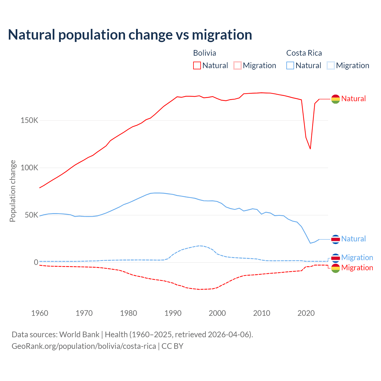 Over the last 10 years, 95.6% of the population change in Bolivia is from natural causes (a gain of 1,637,833 people) and 4.37% is from migration (a loss of 74,903 people). In Costa Rica 96.3% is from natural causes (a gain of 362,624 people) and 3.69% is from migration (a gain of 13,900 people).