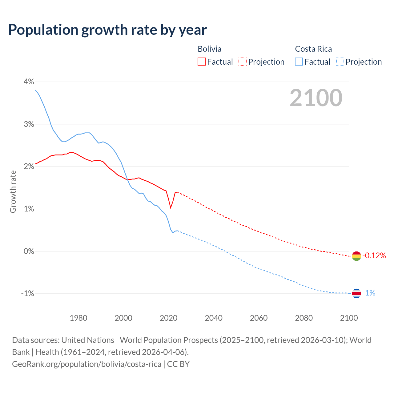 - For the last 10 years, Bolivia has had an average growth rate of +1.37% per year vs +0.77% in Costa Rica.