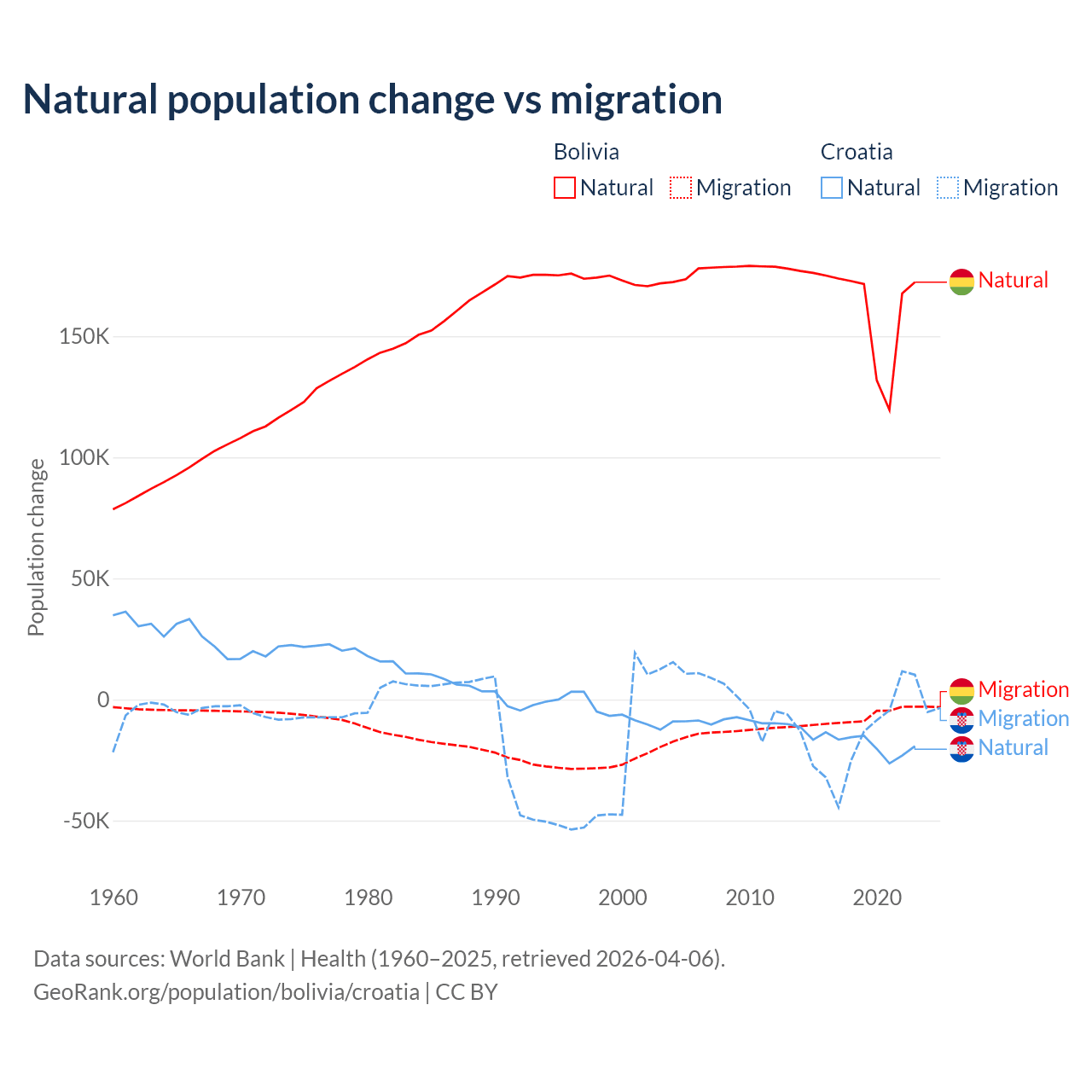 Over the last 10 years, 95.6% of the population change in Bolivia is from natural causes (a gain of 1,637,833 people) and 4.37% is from migration (a loss of 74,903 people). In Croatia 54.8% is from natural causes (a loss of 177,803 people) and 45.2% is from migration (a loss of 146,770 people).