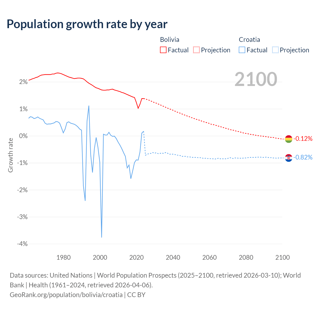 Data sources: World Bank | Health (1960–2024, retrieved 2026-04-06); United Nations | World Population Prospects (1960–2026, retrieved 2026-03-10); U.S. Census Bureau (1960–2025, retrieved 2026-02-08); Central Intelligence Agency (CIA) (2000–2019, retrieved 2026-02-20).