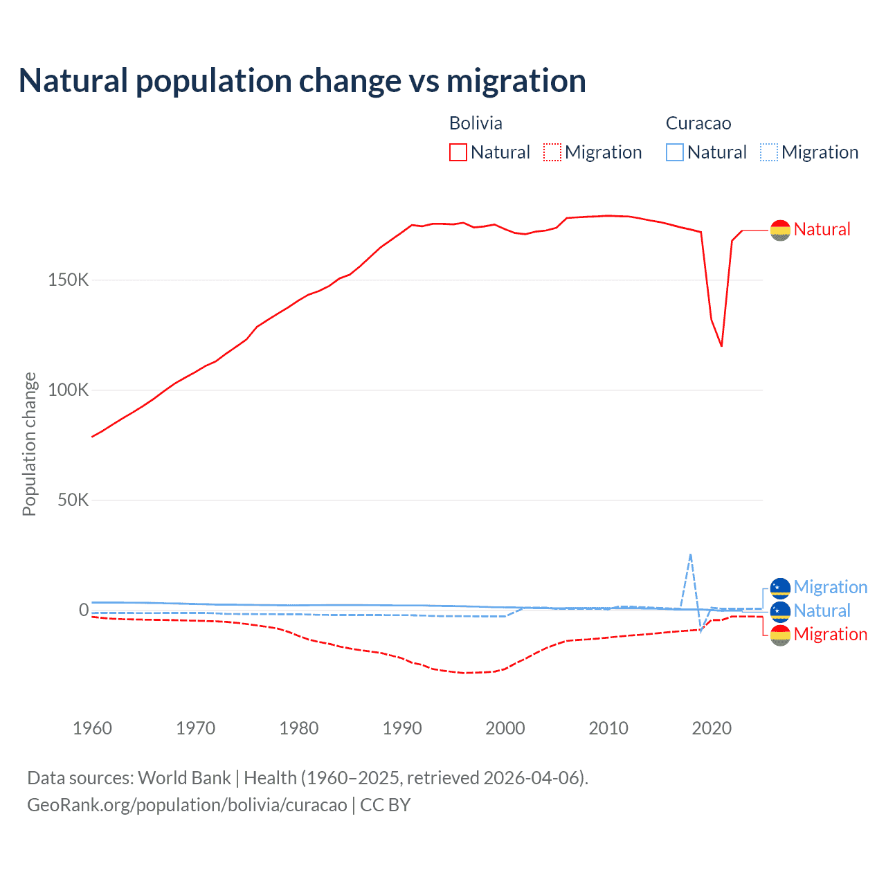 Over the last 10 years, 95.6% of the population change in Bolivia is from natural causes (a gain of 1,637,833 people) and 4.37% is from migration (a loss of 74,903 people). In Curacao 3.72% is from natural causes (a gain of 834 people) and 96.3% is from migration (a gain of 21,615 people).
