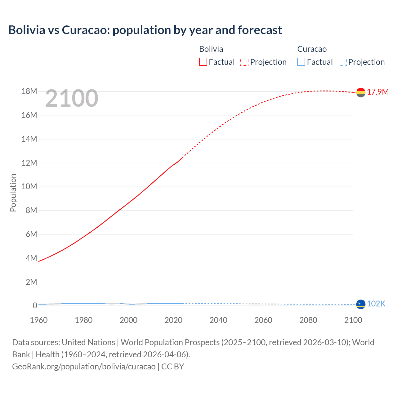 The latest officially reported population of Bolivia was 12,413,315 in 2024 vs 155,967 people in Curacao in 2024. In 2026, based on the adjusted UN estimation, the current Bolivia's population is 12,798,112 people compared to 155,976 in Curacao.