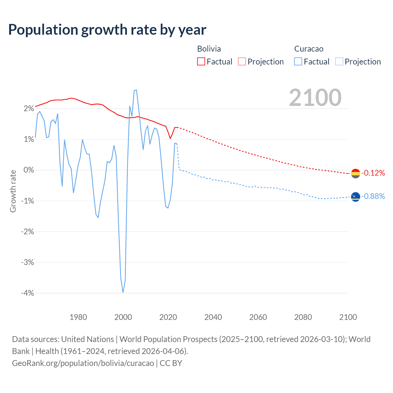 - For the last 10 years, Bolivia has had an average growth rate of +1.37% per year vs +0.13% in Curacao.