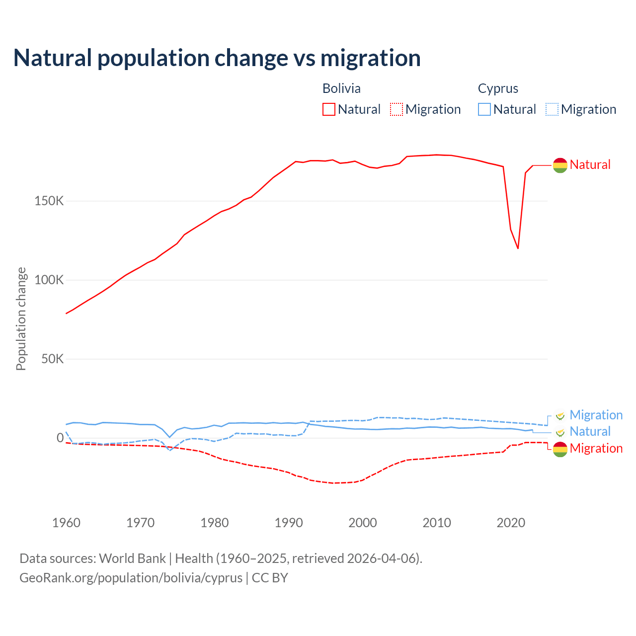 Over the last 10 years, 95.6% of the population change in Bolivia is from natural causes (a gain of 1,637,833 people) and 4.37% is from migration (a loss of 74,903 people). In Cyprus 36.2% is from natural causes (a gain of 57,464 people) and 63.8% is from migration (a gain of 101,458 people).