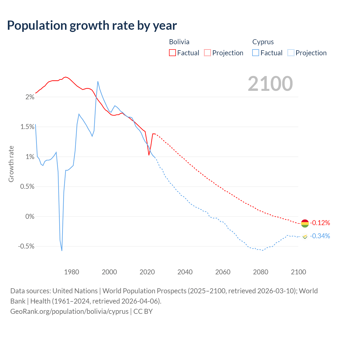 - For the last 10 years, Bolivia has had an average growth rate of +1.37% per year vs +1.26% in Cyprus.