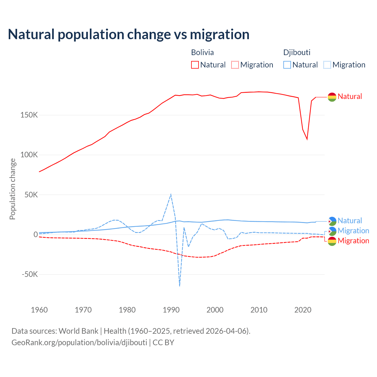 Over the last 10 years, 95.6% of the population change in Bolivia is from natural causes (a gain of 1,637,833 people) and 4.37% is from migration (a loss of 74,903 people). In Djibouti 92.1% is from natural causes (a gain of 153,892 people) and 7.87% is from migration (a gain of 13,138 people).