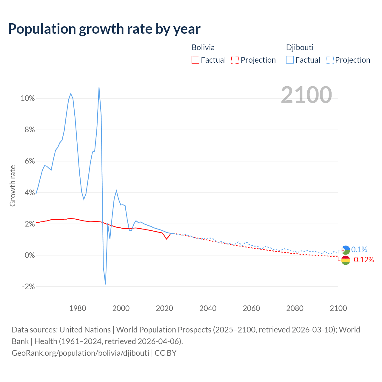 - For the last 10 years, Bolivia has had an average growth rate of +1.37% per year vs +1.57% in Djibouti.