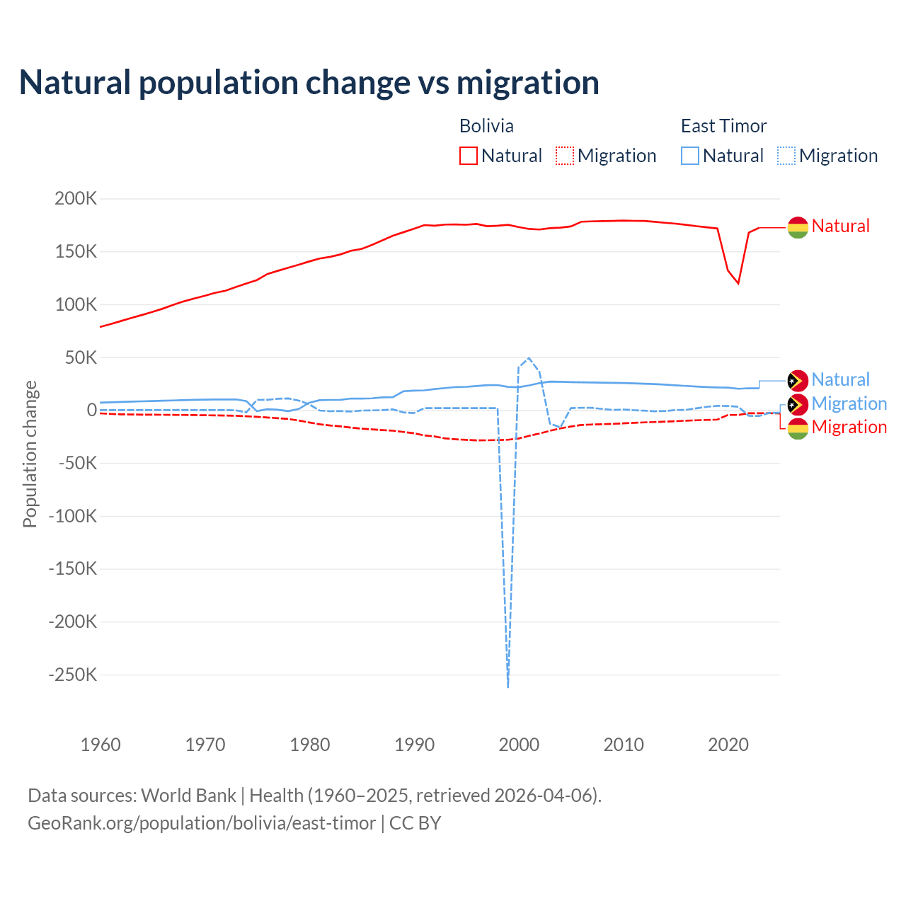 Over the last 10 years, 95.6% of the population change in Bolivia is from natural causes (a gain of 1,637,833 people) and 4.37% is from migration (a loss of 74,903 people). In East Timor 98.3% is from natural causes (a gain of 217,698 people) and 1.66% is from migration (a gain of 3,665 people).