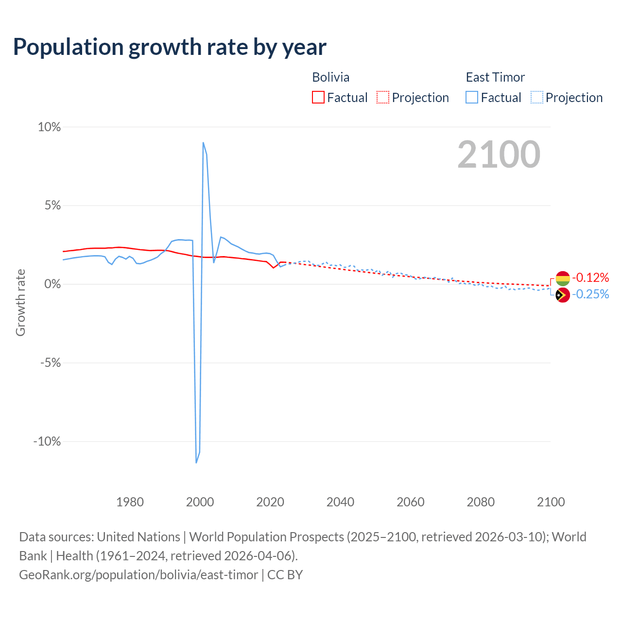 - For the last 10 years, Bolivia has had an average growth rate of +1.37% per year vs +1.74% in East Timor.