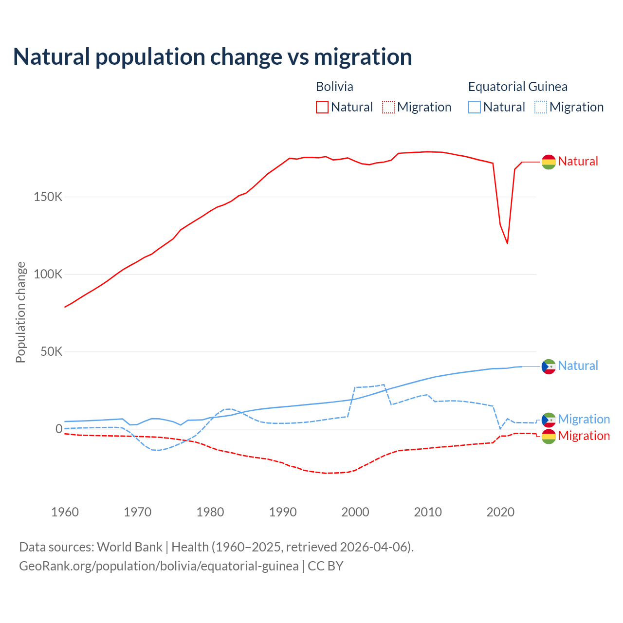 Over the last 10 years, 95.6% of the population change in Bolivia is from natural causes (a gain of 1,637,833 people) and 4.37% is from migration (a loss of 74,903 people). In Equatorial Guinea 77% is from natural causes (a gain of 382,745 people) and 23% is from migration (a gain of 114,024 people).