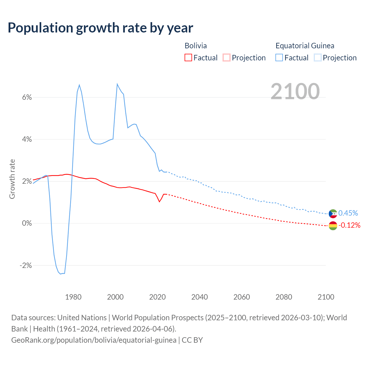 - For the last 10 years, Bolivia has had an average growth rate of +1.37% per year vs +3.15% in Equatorial Guinea.