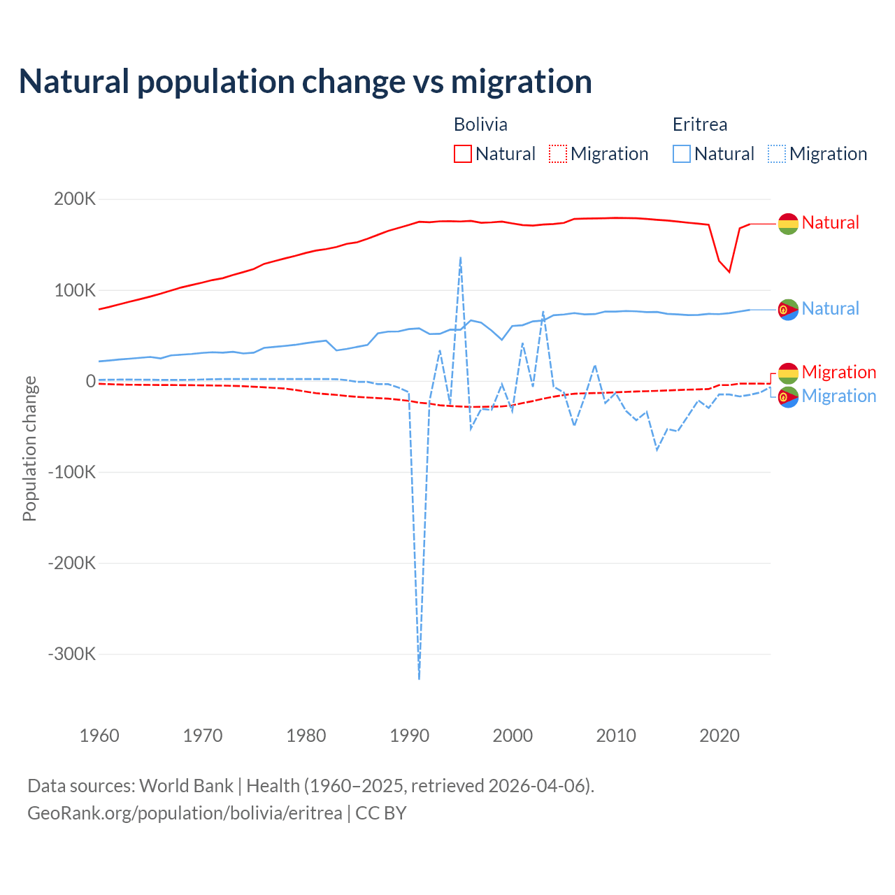 Over the last 10 years, 95.6% of the population change in Bolivia is from natural causes (a gain of 1,637,833 people) and 4.37% is from migration (a loss of 74,903 people). In Eritrea 68.8% is from natural causes (a gain of 742,837 people) and 31.2% is from migration (a loss of 336,243 people).