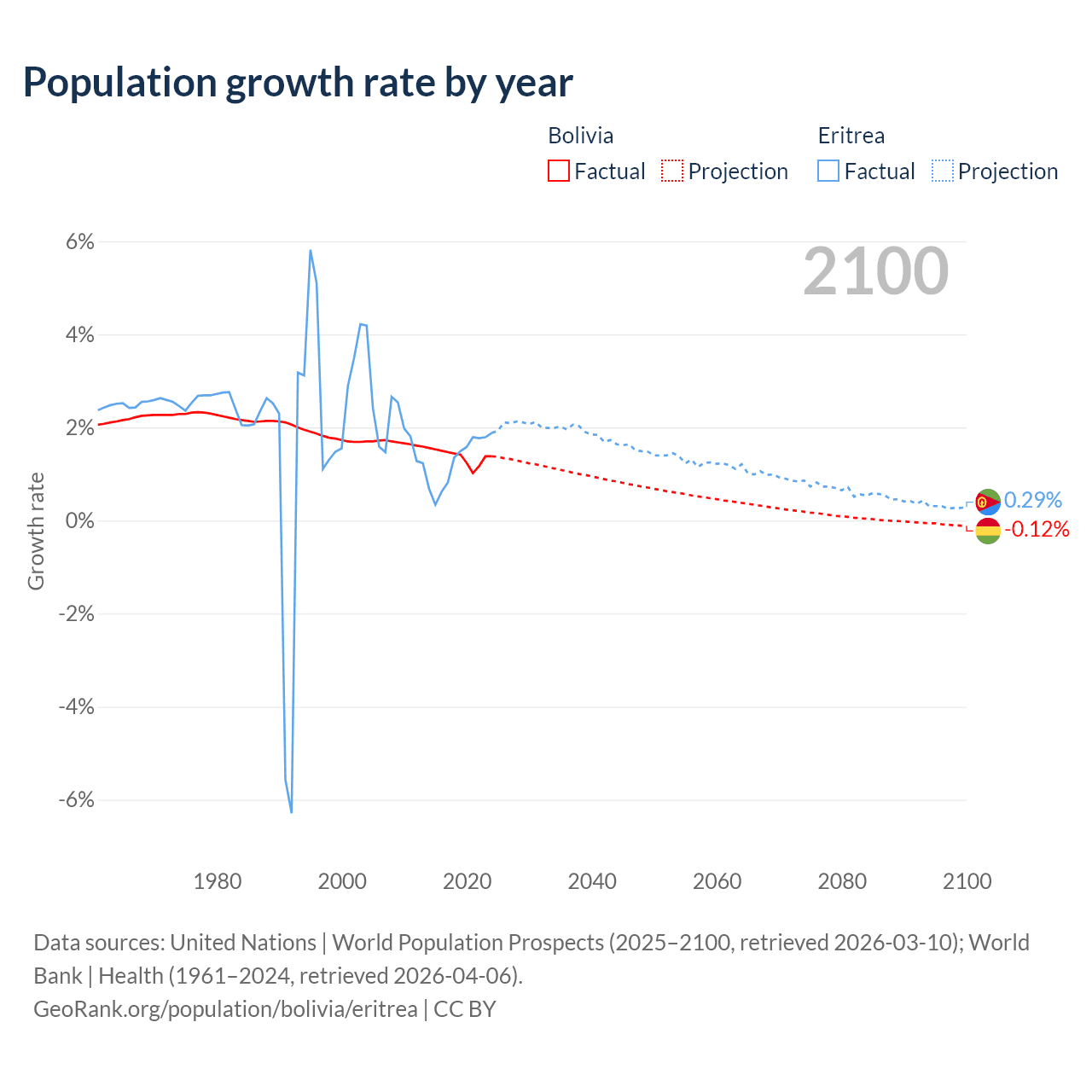 - For the last 10 years, Bolivia has had an average growth rate of +1.37% per year vs +1.28% in Eritrea.