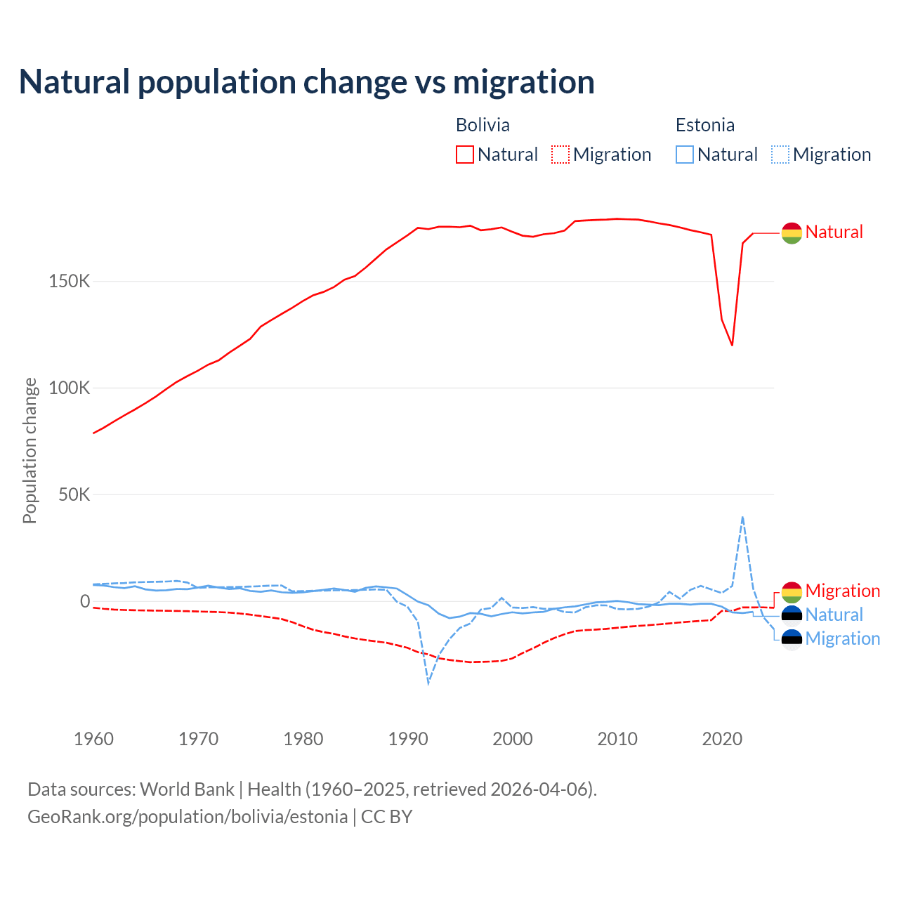 Over the last 10 years, 95.6% of the population change in Bolivia is from natural causes (a gain of 1,637,833 people) and 4.37% is from migration (a loss of 74,903 people). In Estonia 26.1% is from natural causes (a loss of 27,683 people) and 73.9% is from migration (a gain of 78,553 people).