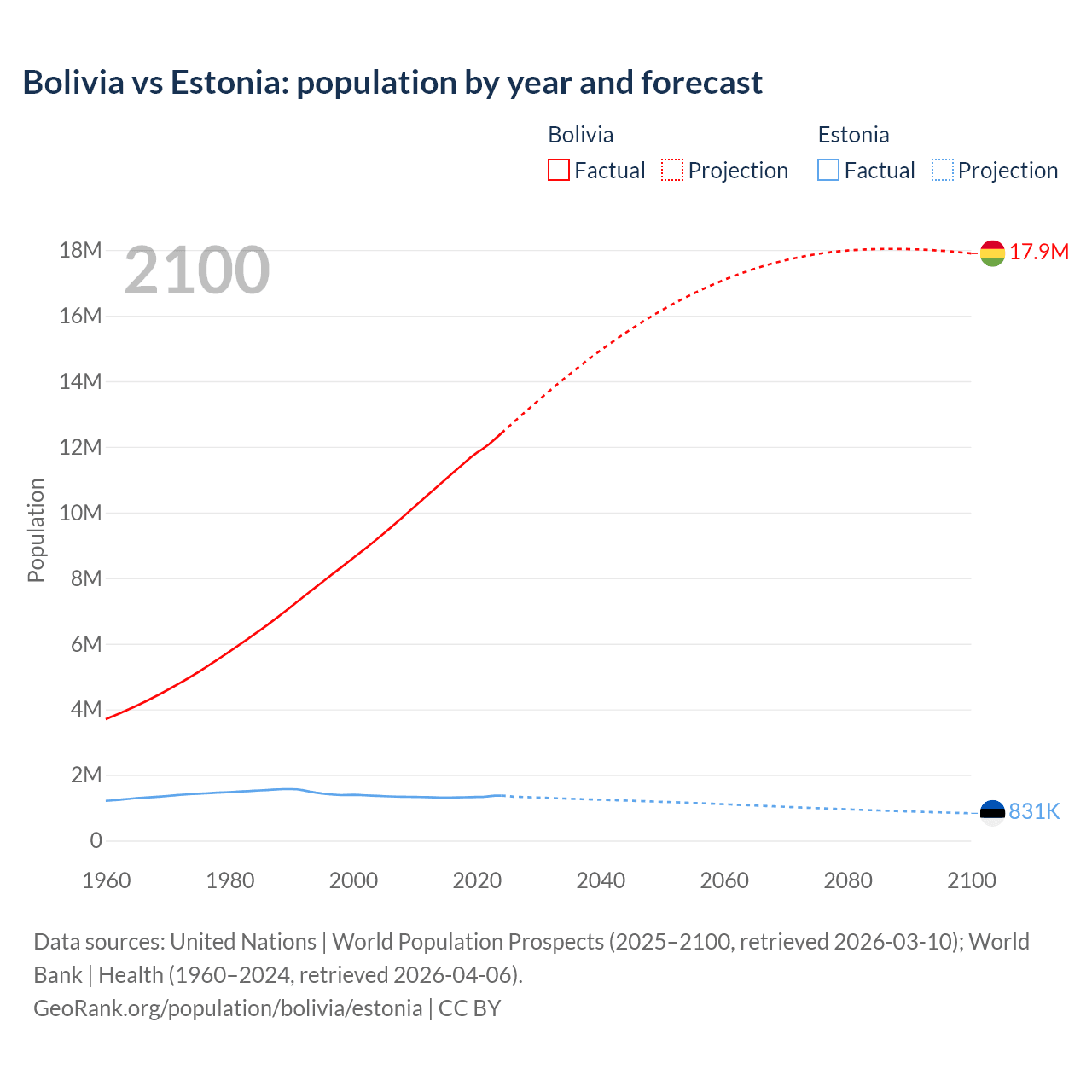 The latest officially reported population of Bolivia was 12,413,315 in 2024 vs 1,372,341 people in Estonia in 2024. In 2026, based on the adjusted UN estimation, the current Bolivia's population is 12,798,112 people compared to 1,339,590 in Estonia.