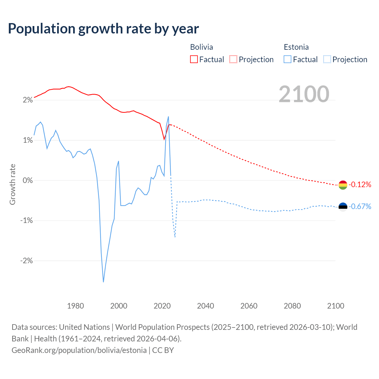 - For the last 10 years, Bolivia has had an average growth rate of +1.37% per year vs +0.37% in Estonia.
