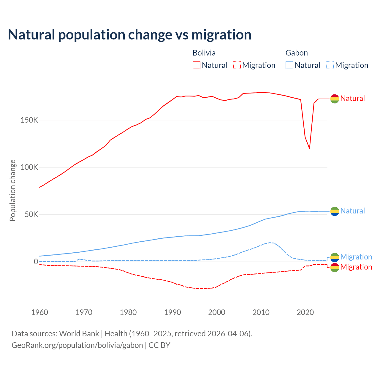 Over the last 10 years, 95.6% of the population change in Bolivia is from natural causes (a gain of 1,637,833 people) and 4.37% is from migration (a loss of 74,903 people). In Gabon 91.1% is from natural causes (a gain of 515,484 people) and 8.86% is from migration (a gain of 50,119 people).