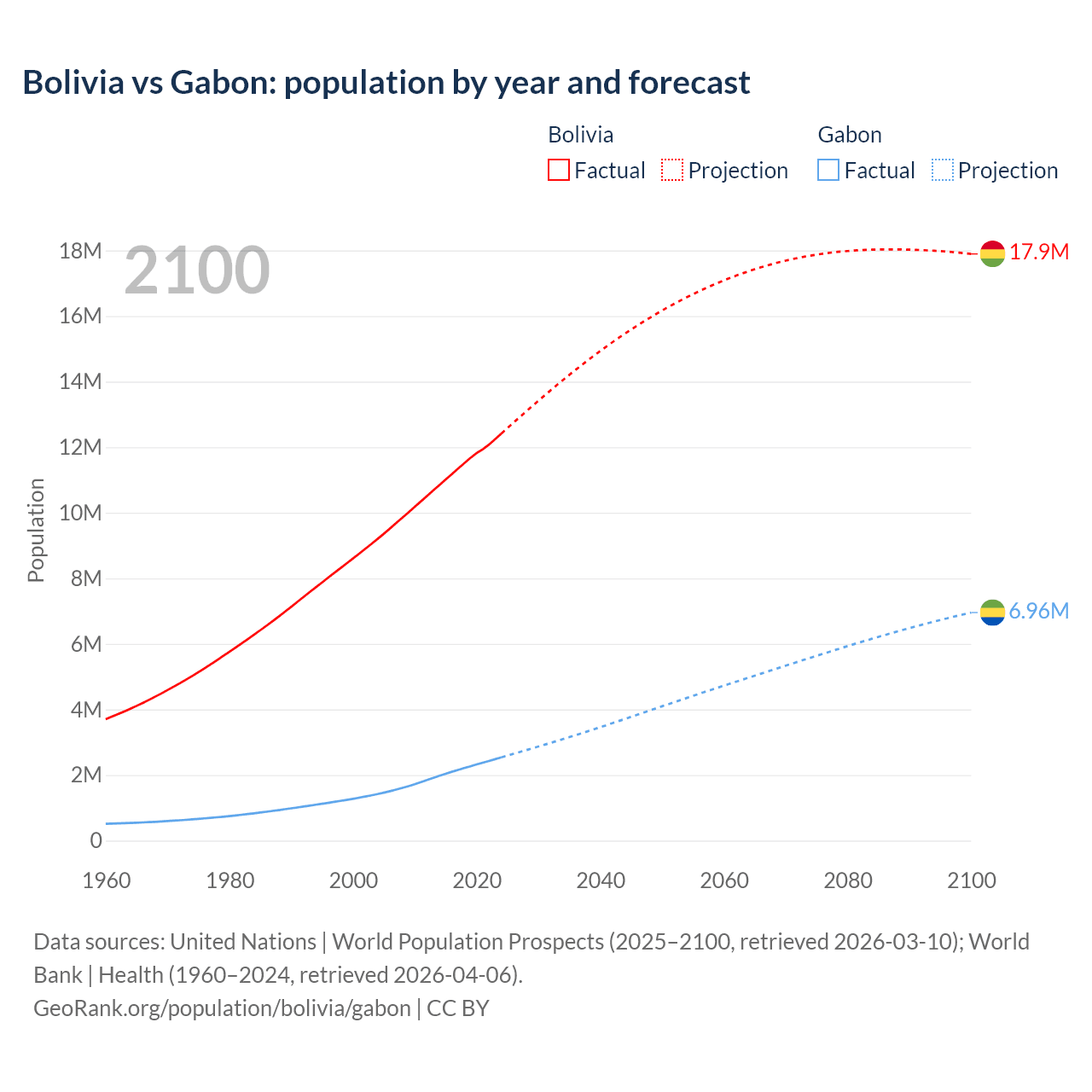 Bolivia vs Gabon: population by year and forecast