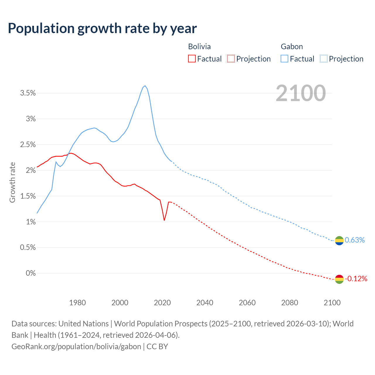 - For the last 10 years, Bolivia has had an average growth rate of +1.37% per year vs +2.61% in Gabon.