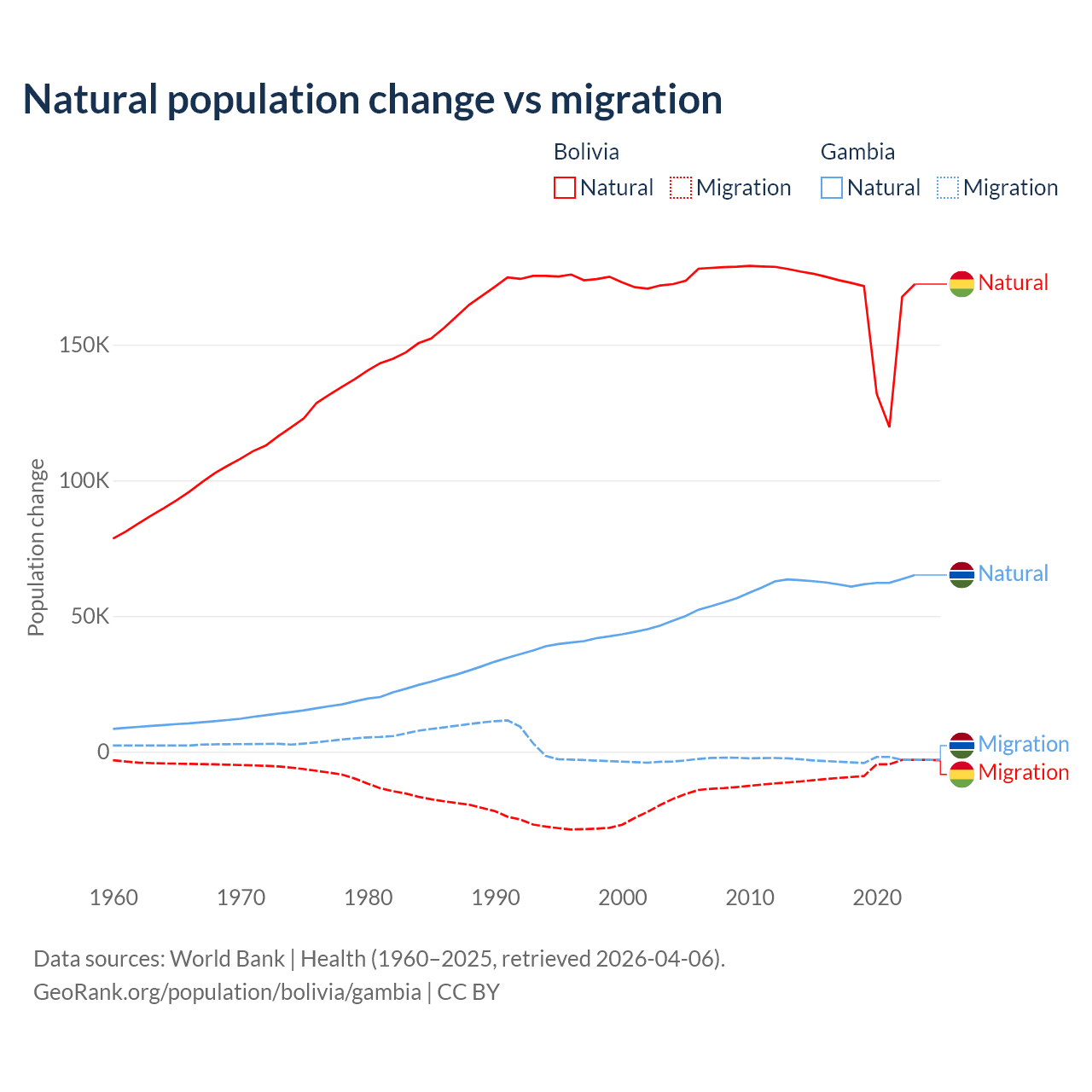 Over the last 10 years, 95.6% of the population change in Bolivia is from natural causes (a gain of 1,637,833 people) and 4.37% is from migration (a loss of 74,903 people). In the Gambia 95.2% is from natural causes (a gain of 625,795 people) and 4.75% is from migration (a loss of 31,227 people).