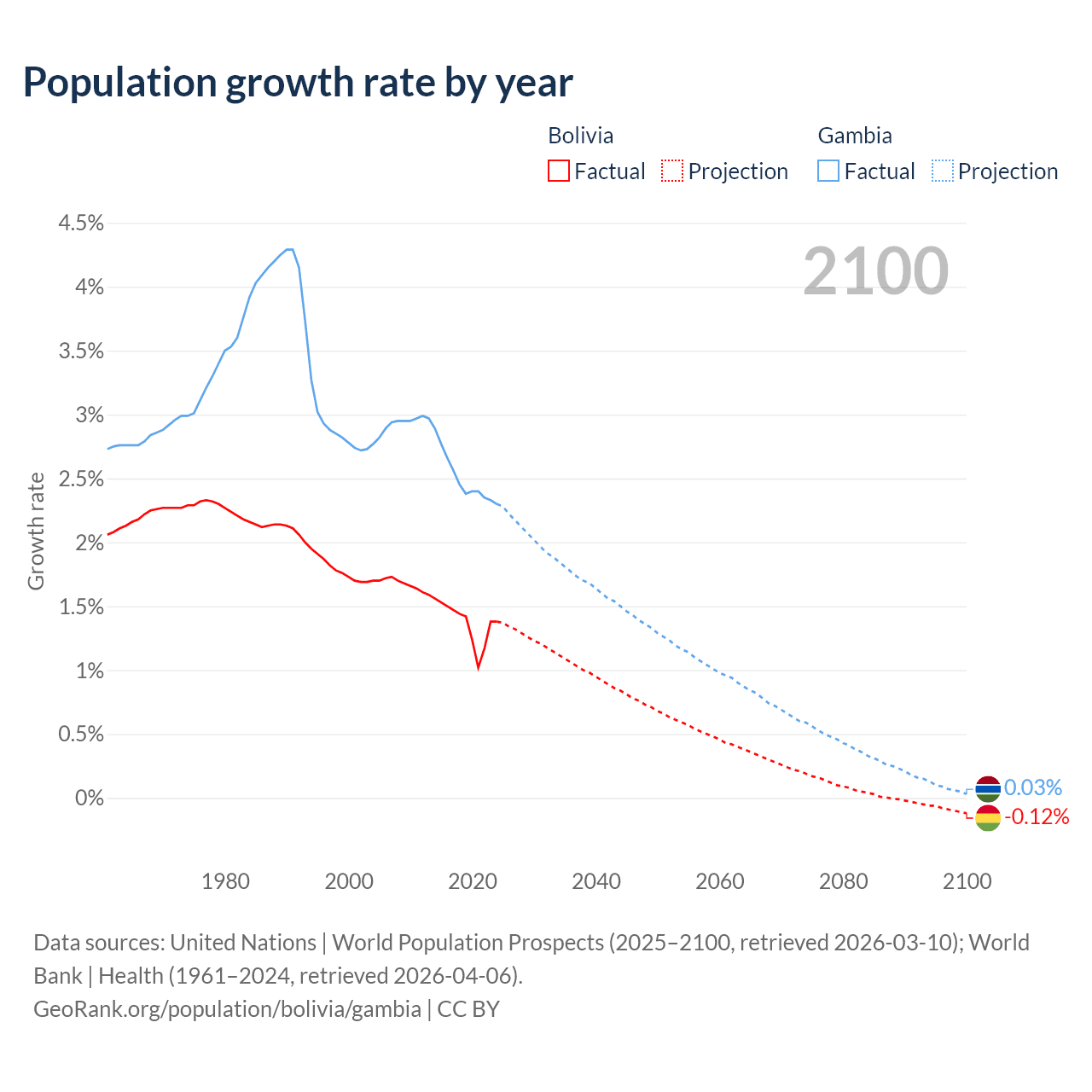 - For the last 10 years, Bolivia has had an average growth rate of +1.37% per year vs +2.5% in the Gambia.